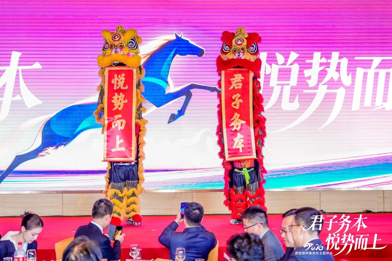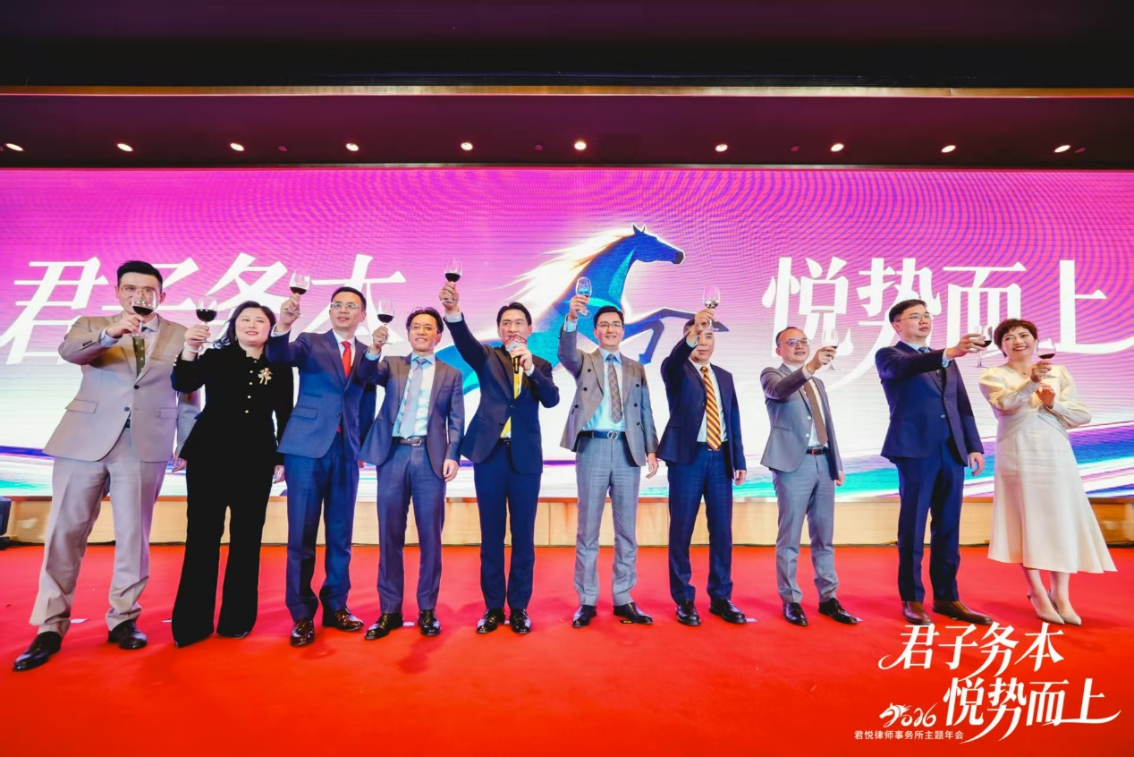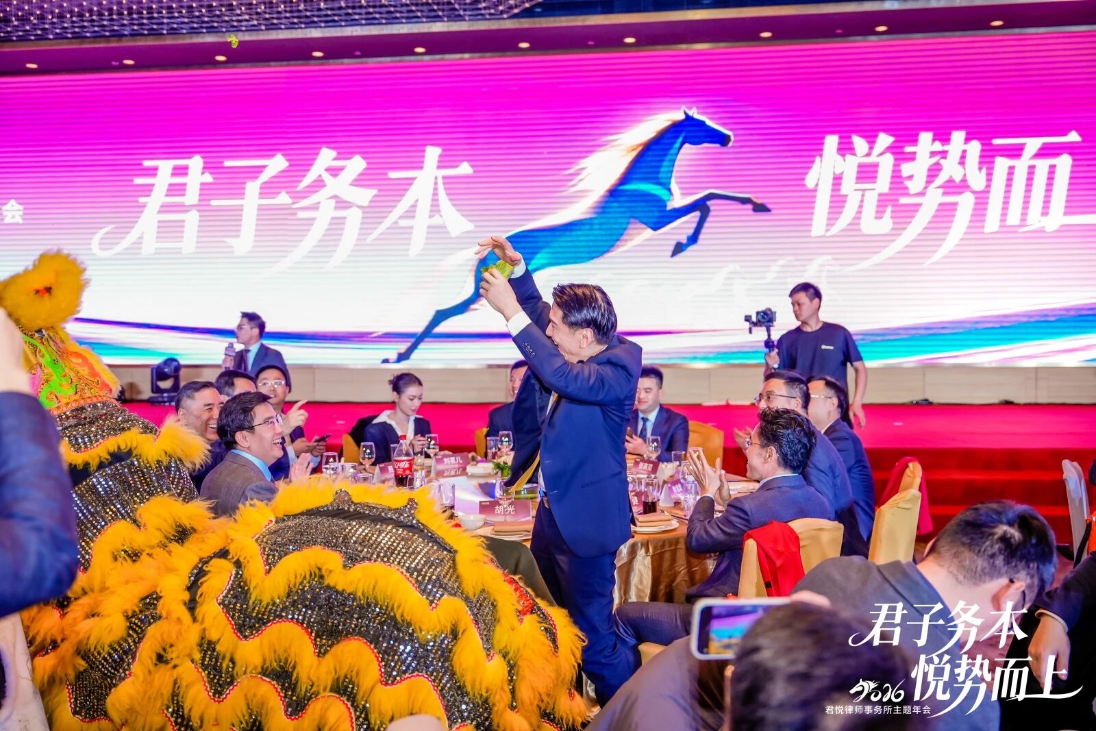 伴随年会所有环节圆满结束,我们迎来了最温馨的举杯时刻。在胡光主任的带领下,7家分所主任及代表、上海总所全体高级合伙人登台祝酒,向在场君悦同仁致以诚挚祝福与殷切期望。路遥千里,笃行可达。2026,君悦人将继续以专业为缰,以信念为鞍,如骏马驰骋,拓疆前行,马到成功!