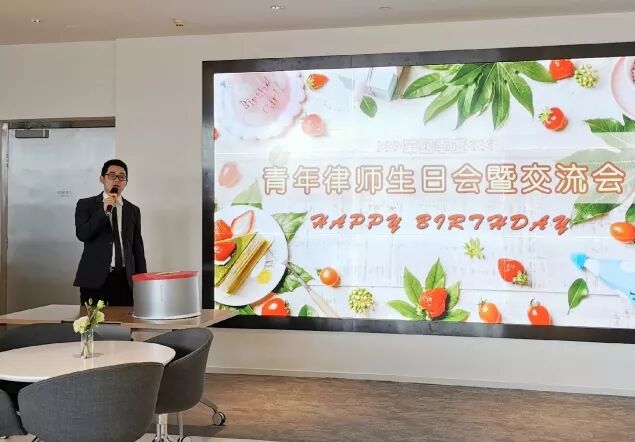 高级合伙人、青工委主任徐凯律师在生日会上致辞。他提出,青年律师应当把握青春,重视积累,广泛阅读,深度思考。青工委已将读书会加入喜悦成长计划,并在律所设立读书角,希望青年律师们能将读书作为生活常态,在书香中博采众长、开阔视野、提升境界。同时,也希望青年律师们能够珍惜君悦所“自在、平等、开放、共享”的平台氛围,以开放的心态迎接变革,积极拓宽自身学习交流渠道,从而实现更加长远的发展。