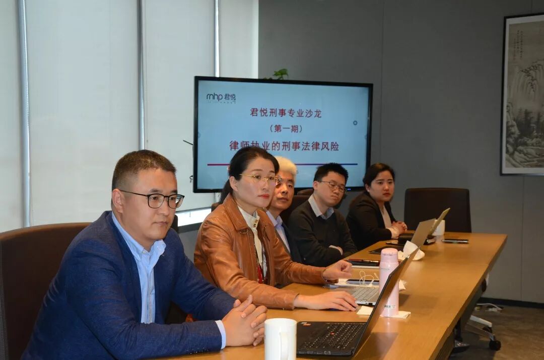 首先,由君悦所高级合伙人、上海市律师协会纪律委员会副主任、风控委主任孔庆德律师通报了近年来律师违纪案件的查处情况,介绍了投诉的主要来源,分析了典型案例,并提出了实务建议。 图片右二:MHP君悦高级合伙人 孔庆德律师 接着,由君悦所高级合伙人、刑委会主任、风控委副主任周楷人律师发表了主题为“律师执业刑事法律风险”分享,周律师介绍了律师执业刑事法律风险中的常见罪名、表现形式和典型案例,并为律师执业提供了干货满满的几点执业建议。 图片左一:MHP君悦高级合伙人 周楷人律师 最后,由君悦所高级合伙人曹剑敏律师分享了“辩护律师如何与当事人及家属沟通”的主题,曹律师结合自己的执业经验,从接案时的案件评估以及案件代理中的沟通等多个时间点为大家介绍了刑事辩护律师与当事人及家属的沟通技巧。 沙龙活动现场 在沙龙活动中,参加活动的律师积极讨论律师执业中可能面临的各种法律风险,尤其是刑事律师会见中经常碰到的风险点、是否可以向当事人家属披露刑事案卷资料、以及与当事人和当事人家属的沟通技巧等多个方面的内容,引起了现场律师的共鸣,大家纷纷加入讨论,分享各自的观点和经验,取得了预期的效果。